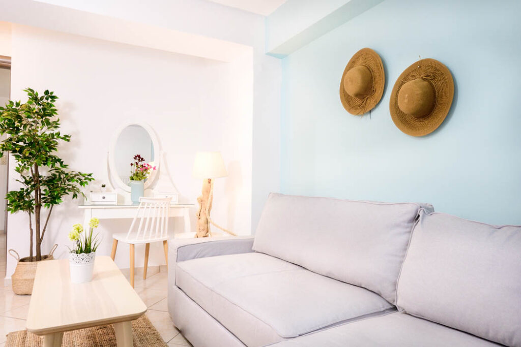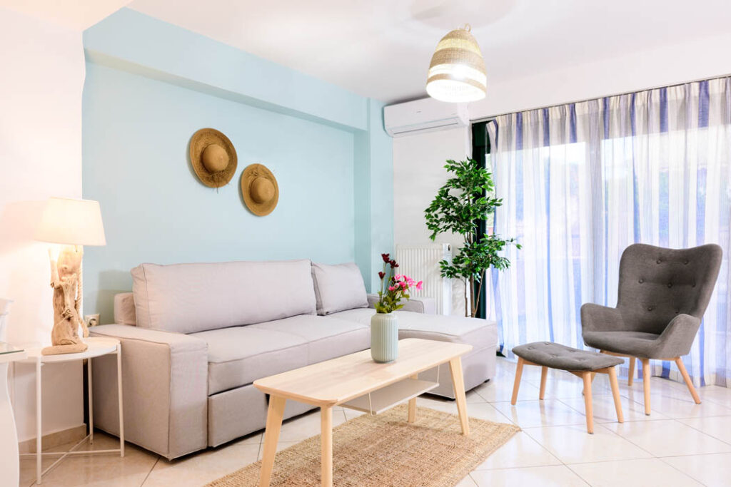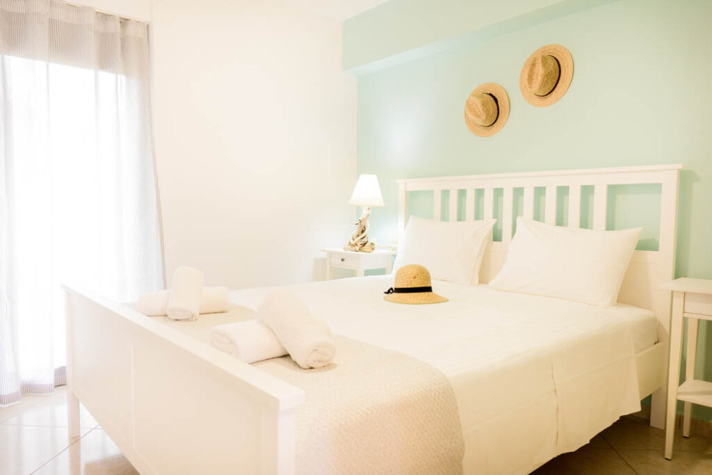 The layout of the apartments is divided into 2 bedrooms and 1 bathroom and an open plan living-dining-kitchen area. Each one individually offers you a unique holiday experience, impressing with its comfort, design and at the same time the warmth it exudes.
